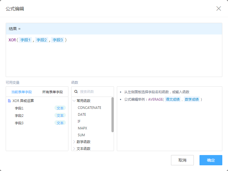 异或值 多个“逻辑表达式”、“表单字段”或“常量”进行判断,结果都相同为假(FALSE),不同为真(TRUE)。