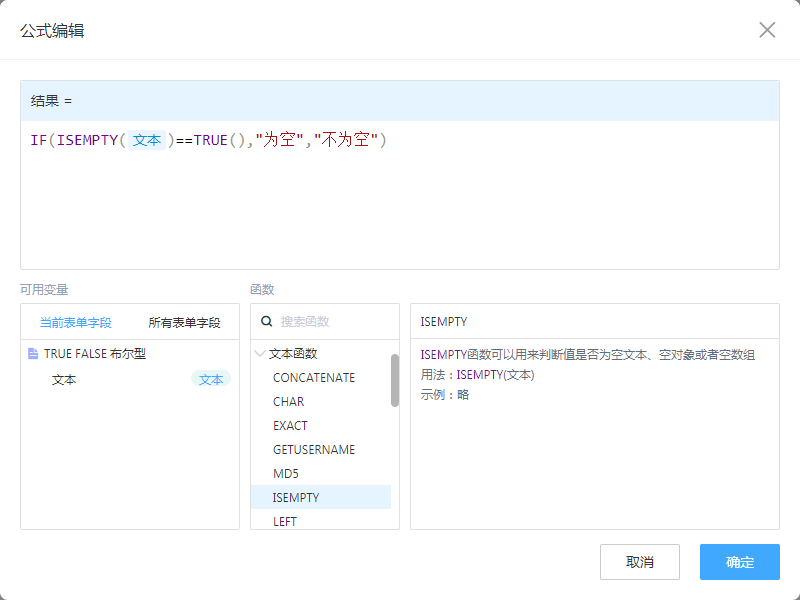 - 判断“文本”是否为空,条件成立值为TRUE(),判断结果等于TRUE(),则返回“为空”,否则返回“不为空”。