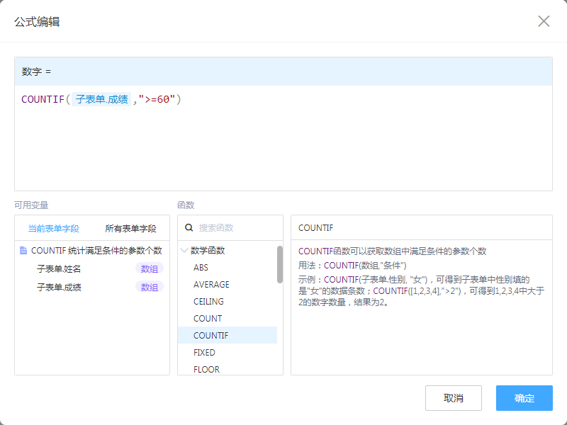 | COUNTIF([1,2,3,1,2], "==2") | 2 | 等于2的个数 |