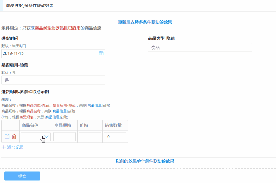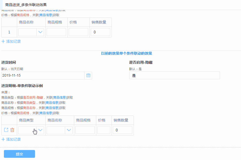 【商品进货-多条件联动效果】:进货时间、商品类型-隐藏、是否启用-隐藏、商品名称、商品规格、价格、销售数量,7个字段。