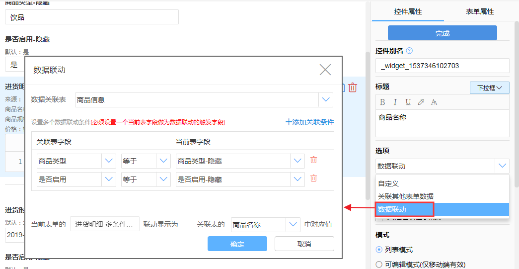 【点击目标控件】——【控件属性-选项】——【数据联动】——【设置联动条件】——【确定】