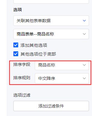 下拉框选项设置为「关联其他表单数据」时,支持对选项进行排序,排序规则分为如下两个部分: