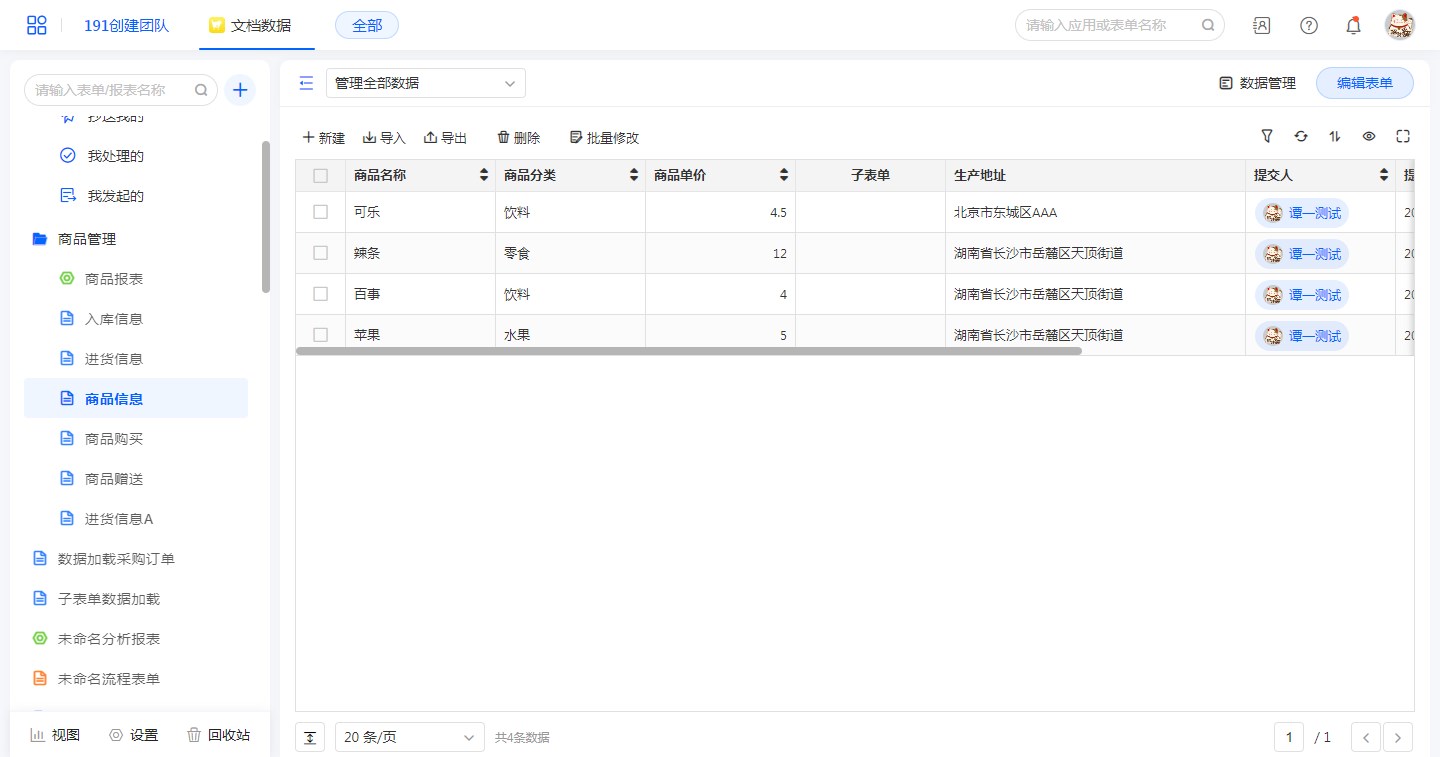 - 页面可以新增、删除、编辑、查看、导入、导出、批量操作、数据回收站、筛选条件,显示字段等所有功能。