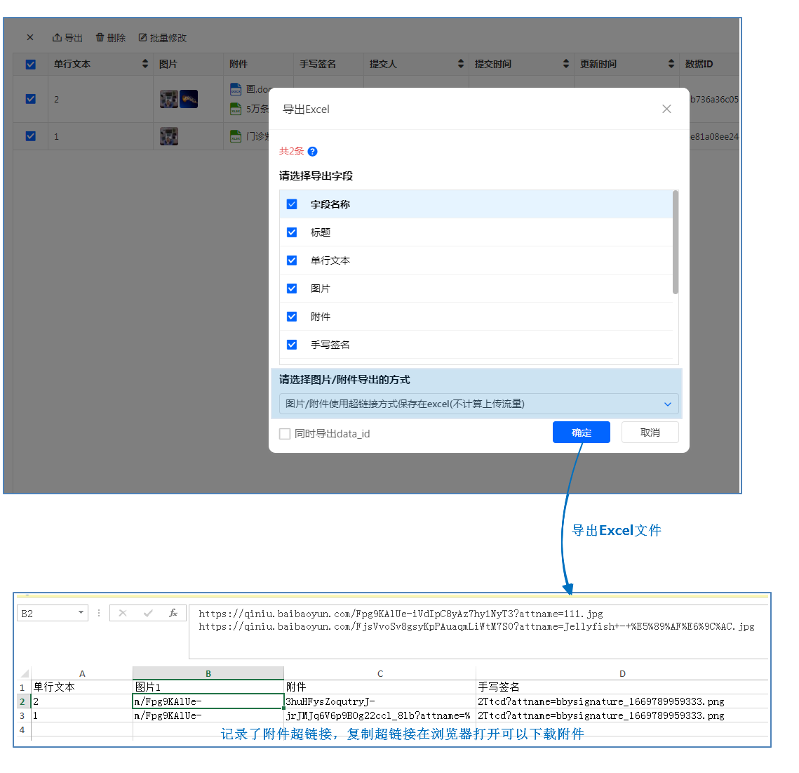 导出文件为Excel文件,如果勾选了导出图片/手写签名/附件字段,图片/手写签名/附件字段会以超链接方式保存在Excel中,用户可以使用超链接下载附件。