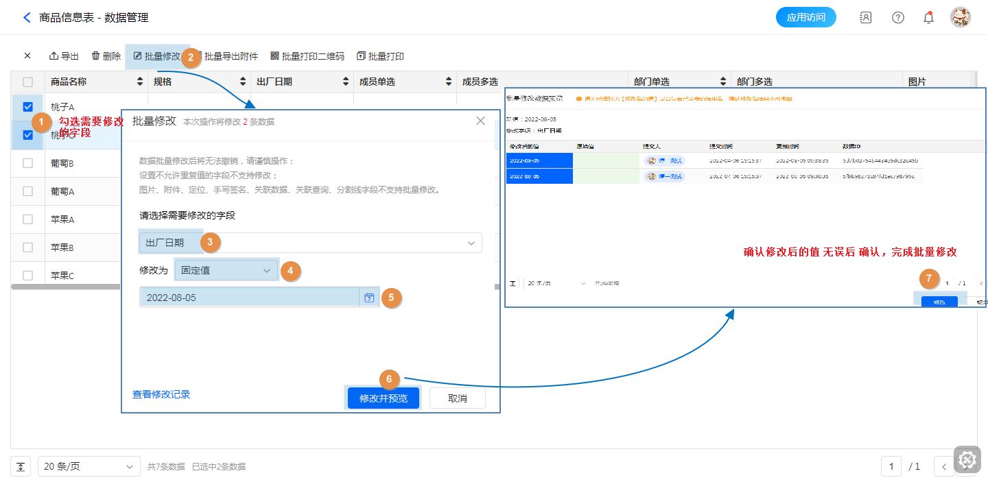 批量修改操作不可逆,务必确保数据修改无误后再确认修改。