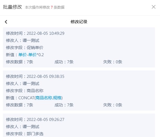 可以查看批量修改日志信息,包含修改时间、修改人、修改字段、新值、修改数据等。