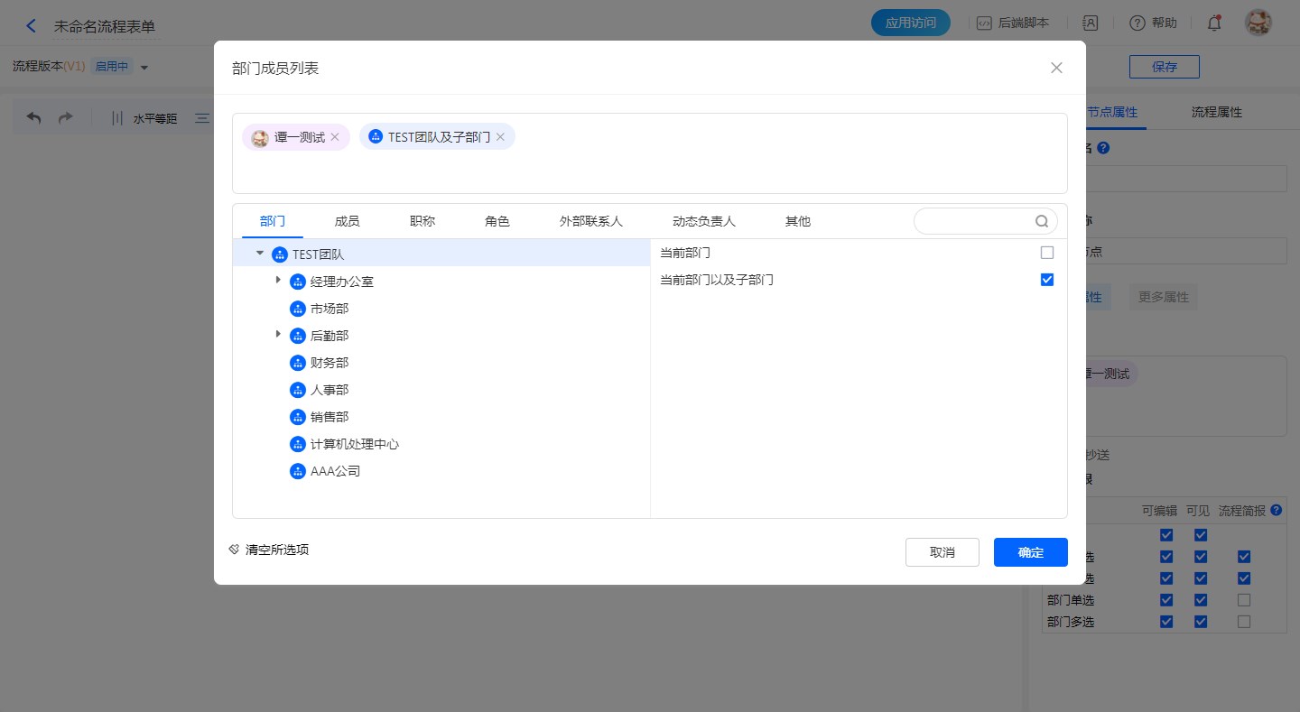 节点负责人可设置多个,勾选对应的部门、角色、成员等即可。