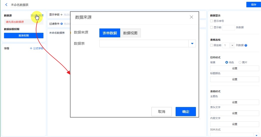 数据源就是指当前数据表的数据来源,可以是表单、数据视图、聚合表。