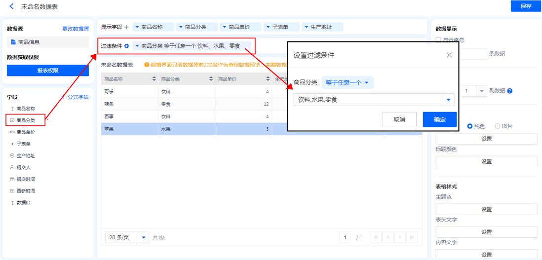 除了可以通过上面的样式对数据表显示的内容进行调整,还可以通过设置数据筛选颜色,高亮需要进行额外标注的信息