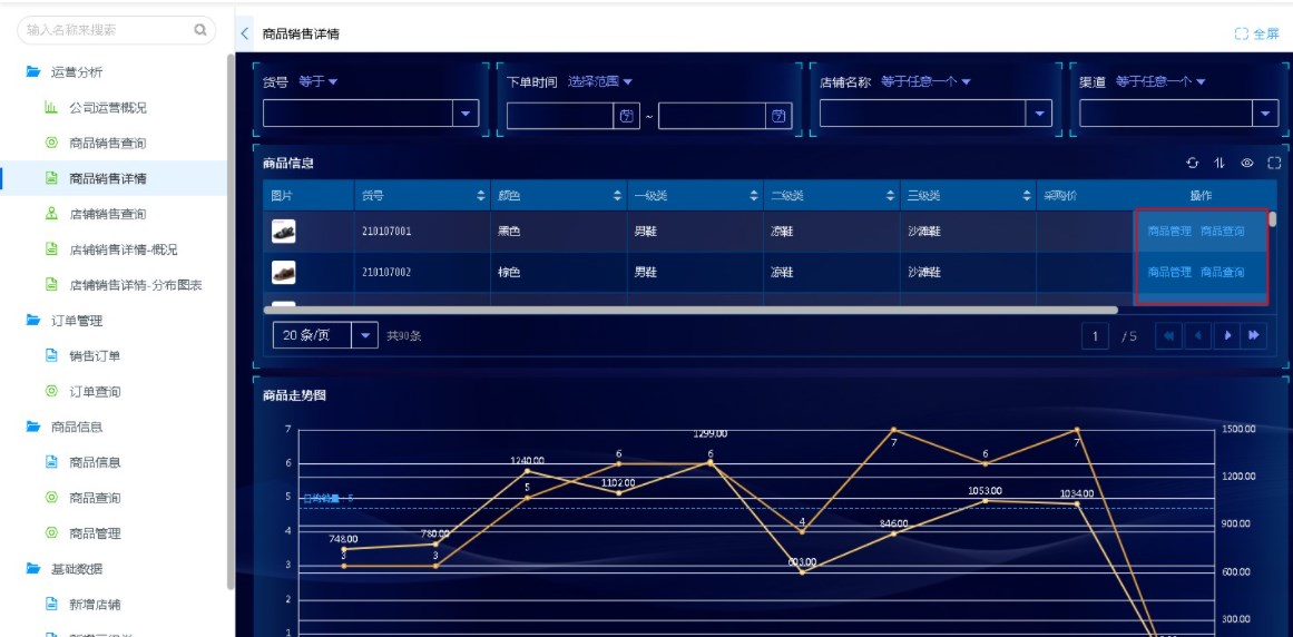 数据表适合任何场景,尤其适用于需要进行复杂交互的场景,如:运营分析系统中,商品销售查询和商品销售详情表单中就利用数据表的功能,实现了复杂交互场景的实现。