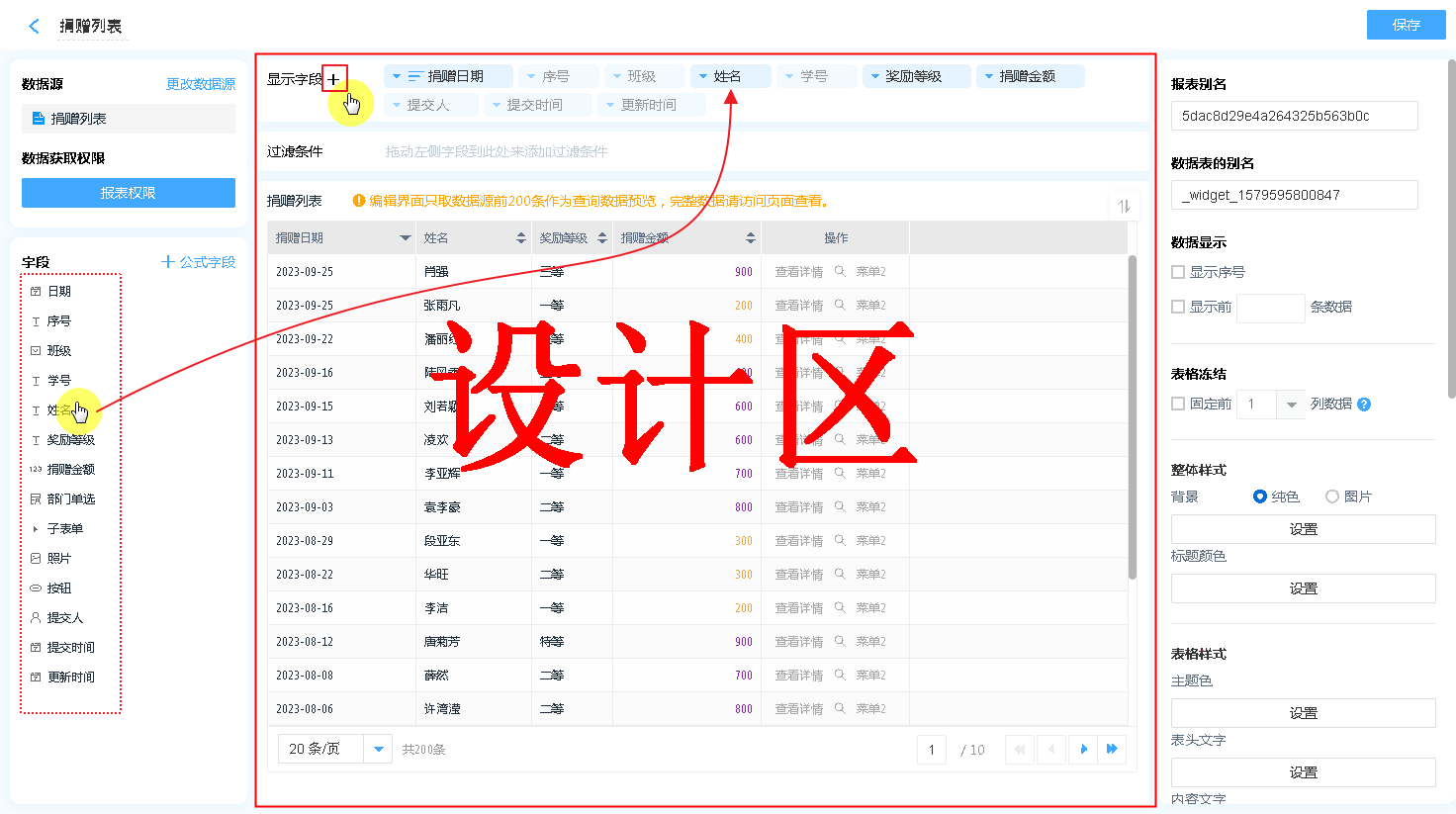 显示名称: 字段添加进入显示字段区域后,可自行修改其在数据表中的表头文字 -