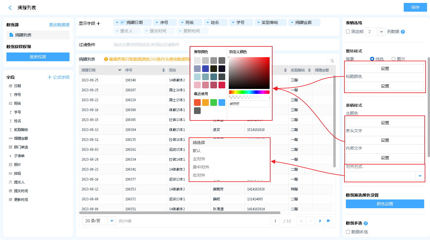 数据表支持样式自定义,可自定义的包括:整体样式、表格样式
