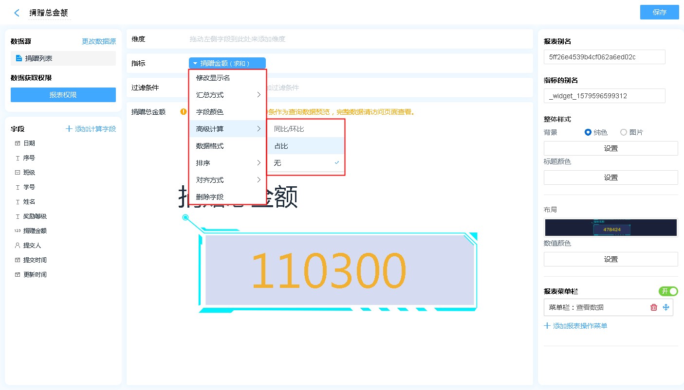 显示名称: 字段添加进入显示字段区域后,可自行修改其在指标图中的表头文字汇总方式: 指标的汇总方式仅支持数字字段,非数字字段在拖入指标中,汇总方式只有计数一项。字段颜色: 设置当指标的数值按照指定颜色进行显示。高级计算:高级计算可进行同环比、占比的计算,详见同环比和占比。数据格式:可通过数据格式的设计,在报表中显示自己想要的格式,详见数据格式详解。排序:支持按照指定的格式对指标图内的数据进行排序[默认为数据创建时间]对齐方式:支持报表单元格文字的排列方式删除字段:此处的删除字段,是指从指标中删除,删除后仍可重新添加,不会对原表造成任何影响。
