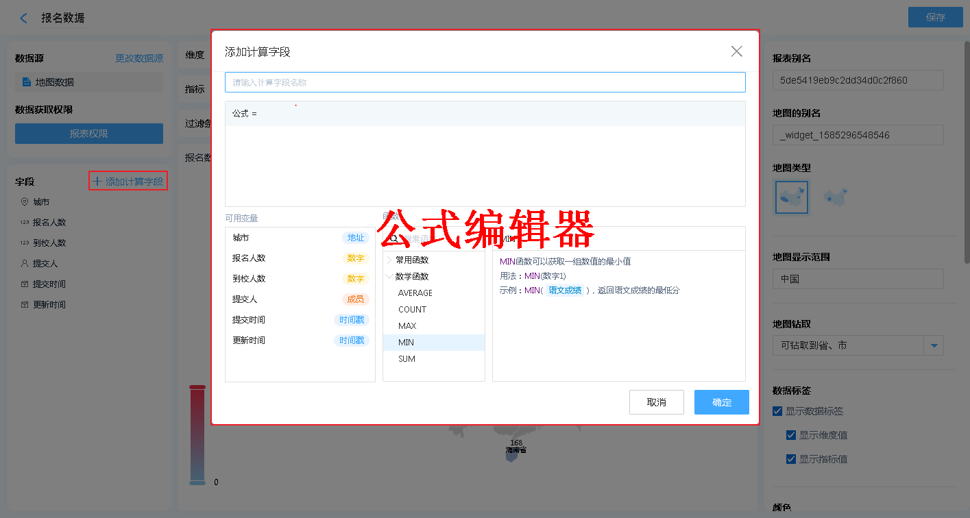 也可以通过增加公式字段,对报表中显示的内容进行简单的计算处理【支持绝大多数数学函数及+-*/四则运算】。