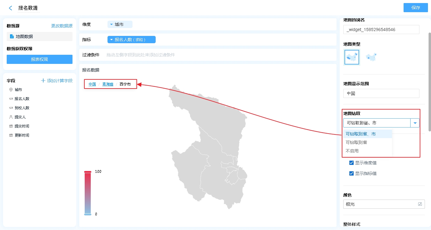 地图钻取可设置为[可钻取到省、市]、[可钻取到省]、[不启用]。