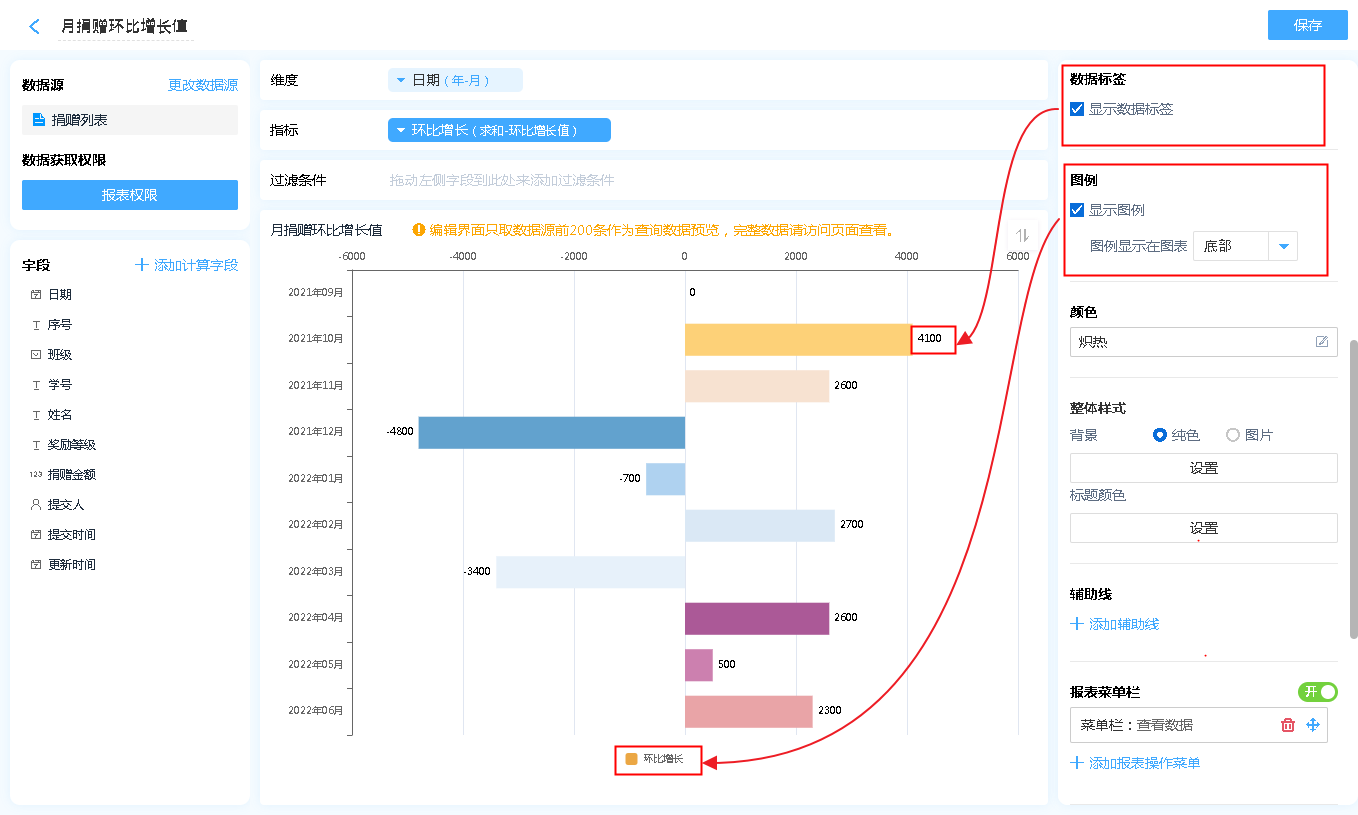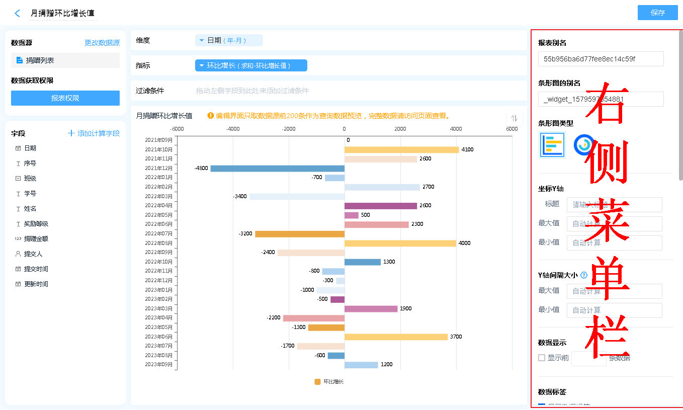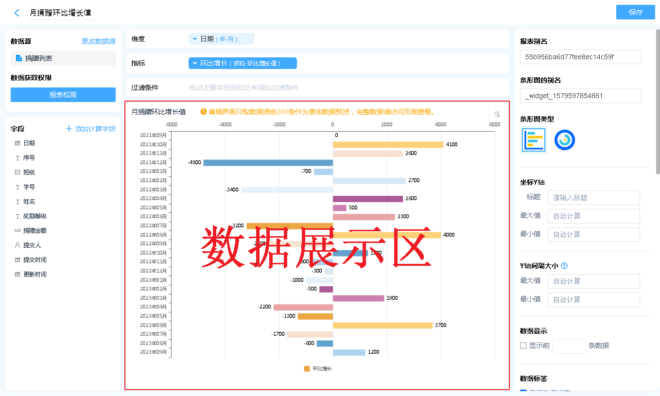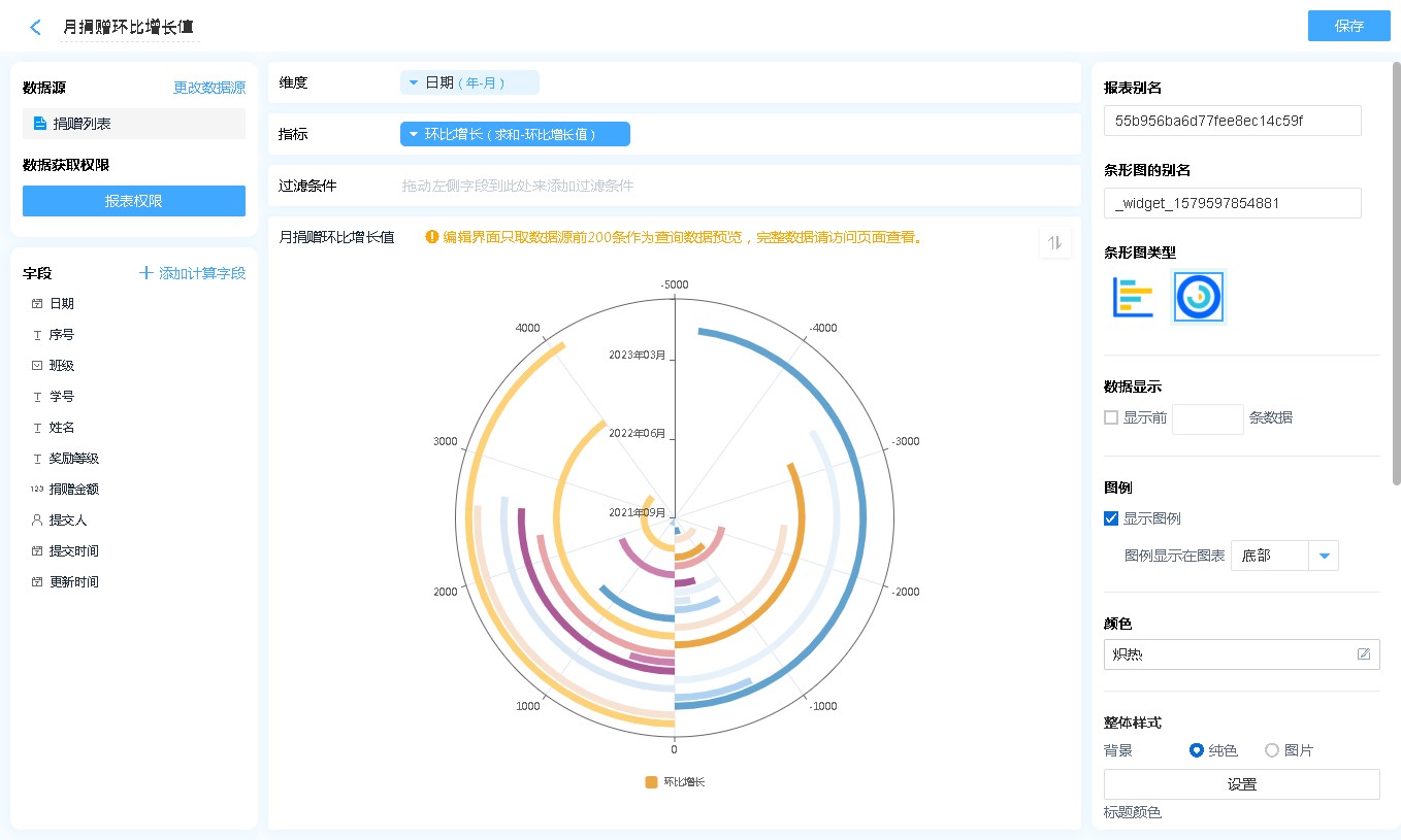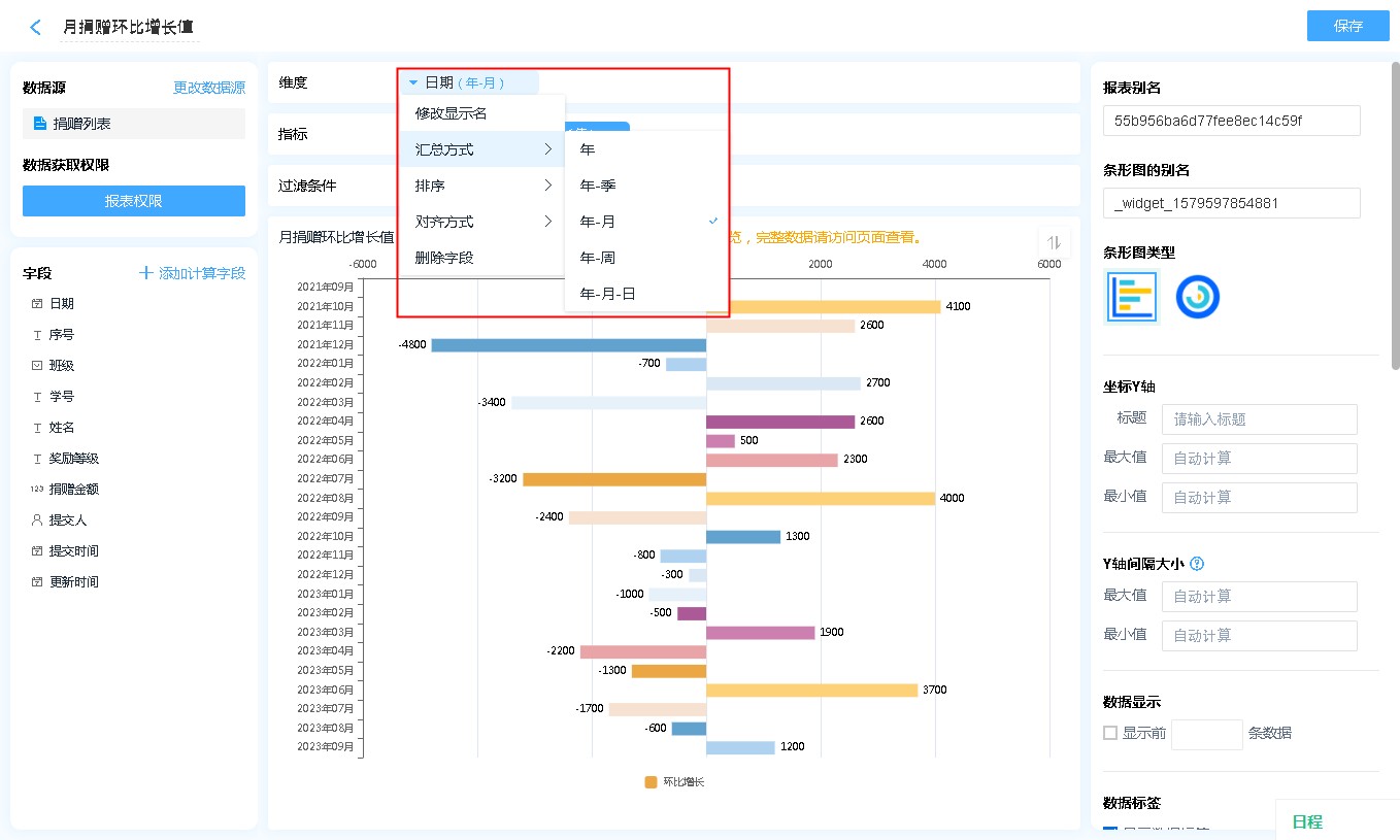 显示名称: 字段添加进入显示字段区域后,可自行修改其在条形图中的表头文字汇总方式: 仅日期时间字段可设置,可以设置按照何种日期格式对数据进行汇总(如:按年、按季度、按月汇总)排序:支持按照指定的格式对条形图内的数据进行排序[默认为数据创建时间]对齐方式:支持报表的排列方式删除字段:此处的删除字段,是指从显示字段中删除,删除后仍可重新添加,不会对原表造成任何影响。