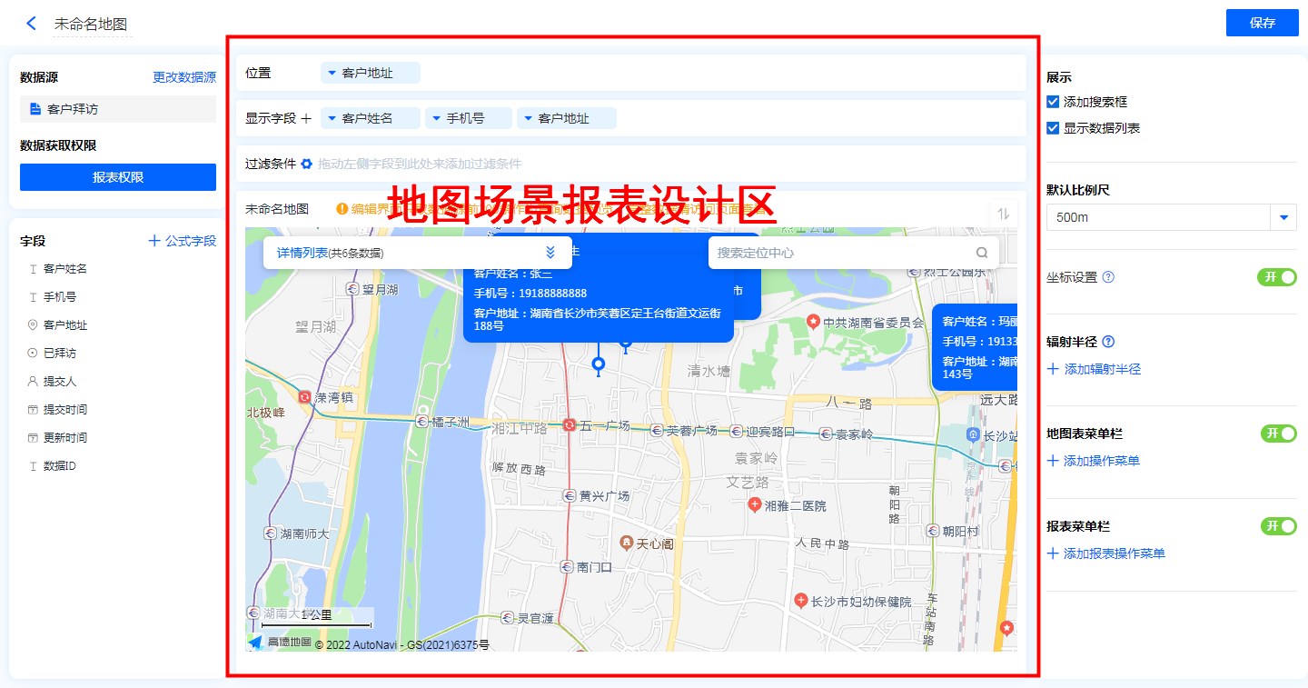 地图报表适合在员工外勤、CRM客户定位、供应链、物流配送定位等系统中使用。如:场景地图中,地图场景报表报表中就利用地图报表的定位和导航功能,实现精准定位客户位置的功能。