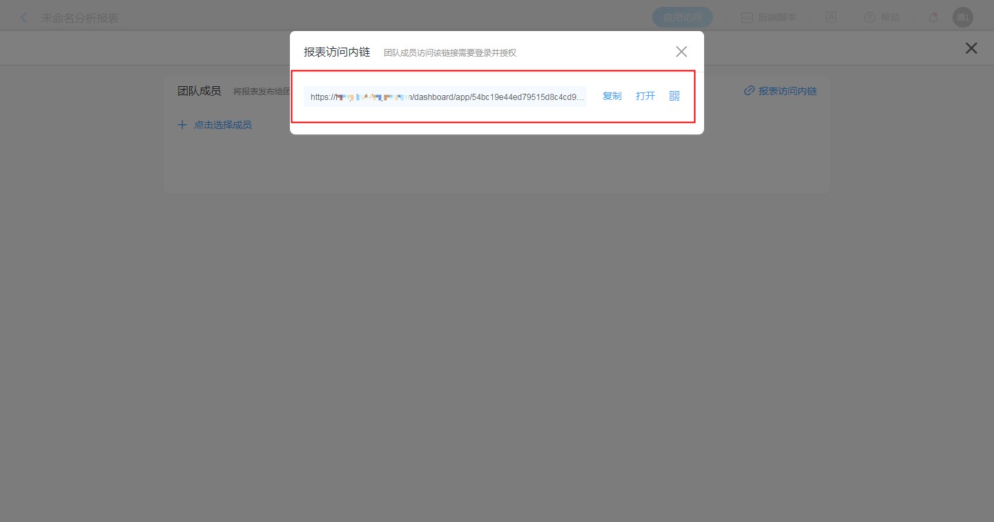 点击可以获取报表访问内链的链接和二维码。可以直接复制链接发给成员,也可以下载表单二维码。 注意:发送前需要给成员开通相关权限,详情参见报表权限。