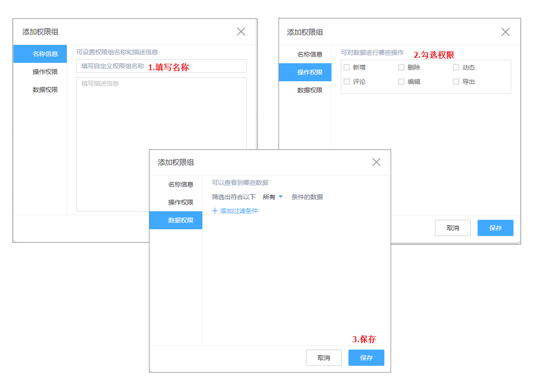 如果我们需要用户打开外链即可对数据进行批量删除或可对单条数据进行编辑修改、删除操作,那我们需要在报表【报表权限】里【新建权限组】,在添加的权限组里勾选对应的操作权限保存并将新的权限组的权限设置为【公开权限】。