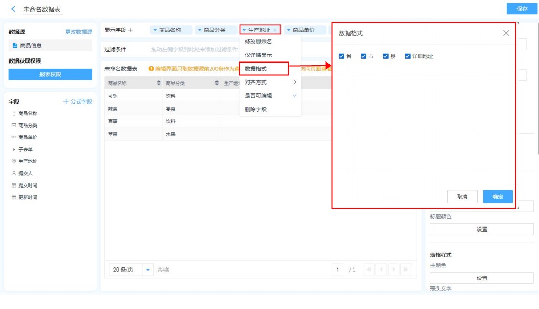地址字段,日期字段,数字字段的格式设置很简单,只需要在报表中编辑字段,选择自己需要的格式即可。