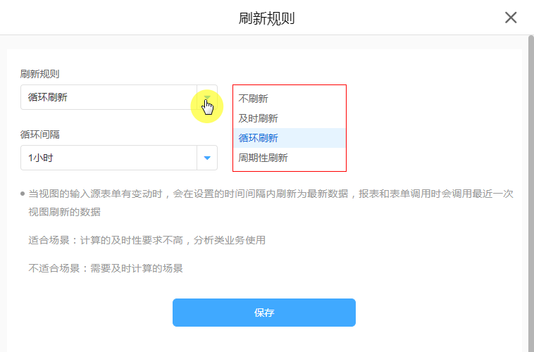 设置数据视图的刷新规则,设置规则后会定时在天/周/月/年的某天某个时间刷新数据,报表和表单调用时会调用最近一次的视图刷新的数据。一般用于大数据量时,周期性汇总分析时使用。