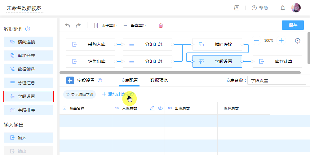 - 配置:字段设置,配置计算字段,即可通过“入库”总数与“出库”总数,计算出最新剩余库存。