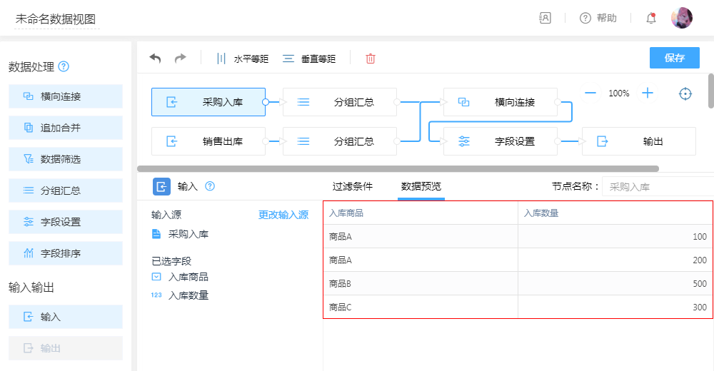 - 配置:横向连接,以“商品”为连接字段,把出入两表数据进行横向拼接,把“入库”与“出库”数据横向拼接为一张表。