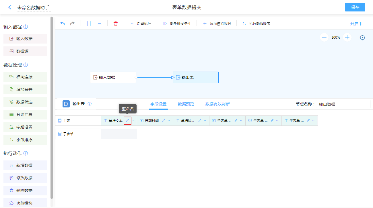 注意:在【表单属性】——【表单提交/编辑/删除数据】新建数据助手并且助手为前置执行时,当结果集为空时,执行中断,不允许提交/编辑/删除数据。