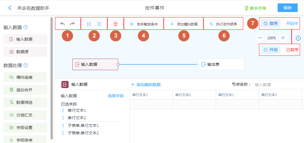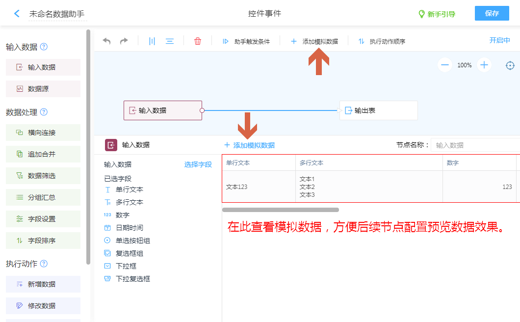 | ⑤ | 添加模拟数据 | 填写模拟数据方便查阅数据处理各类效果预览。 |