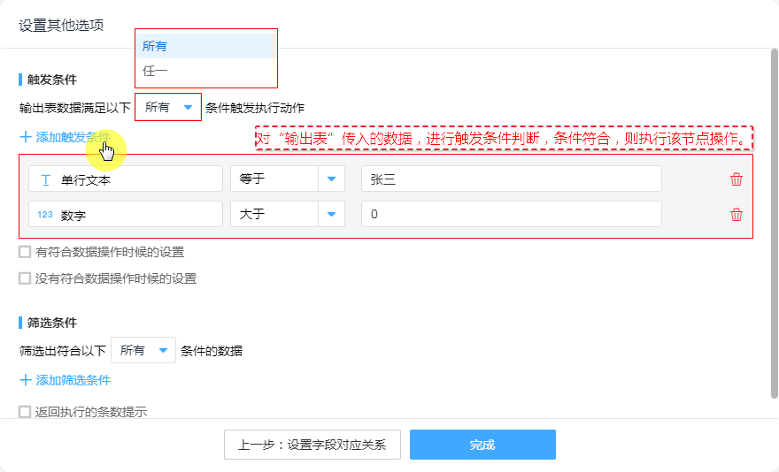 - 输出表数据满足以下“所有”条件触发执行动作。