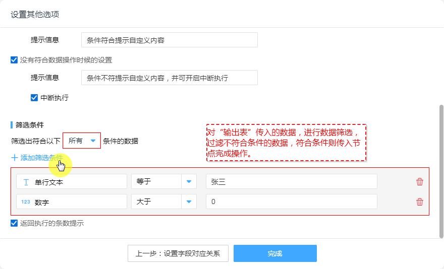 - 对“输出表”传入的数据,进行数据筛选,过滤不符合条件的数据,符合条件则传入节点完成操作。